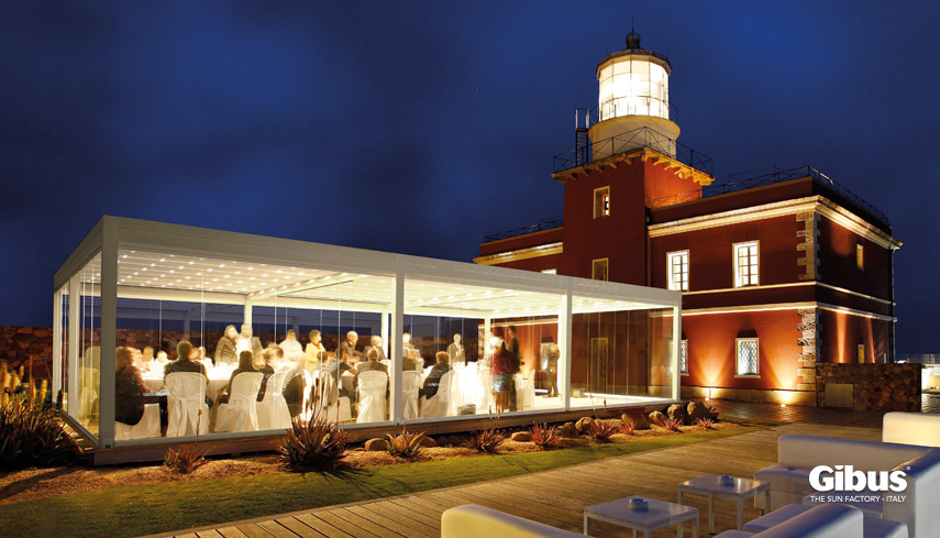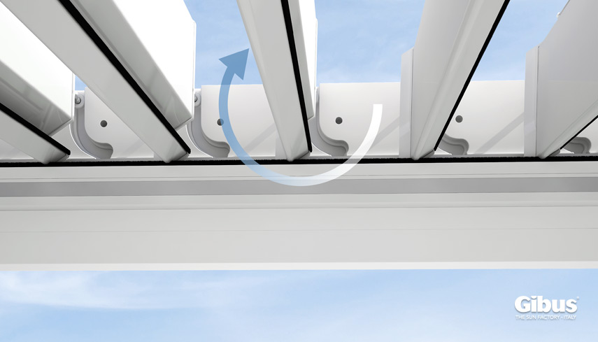 La structure est en aluminium thermolaqué RAL à choix, la couverture est formée de lames métalliques basculantes, en version fermée, pratiquement étanche. Sous le soleil, les lames ouvertes améliorent le bien-être, créant un flux naturel qui déplace l’air chaud vers le haut.